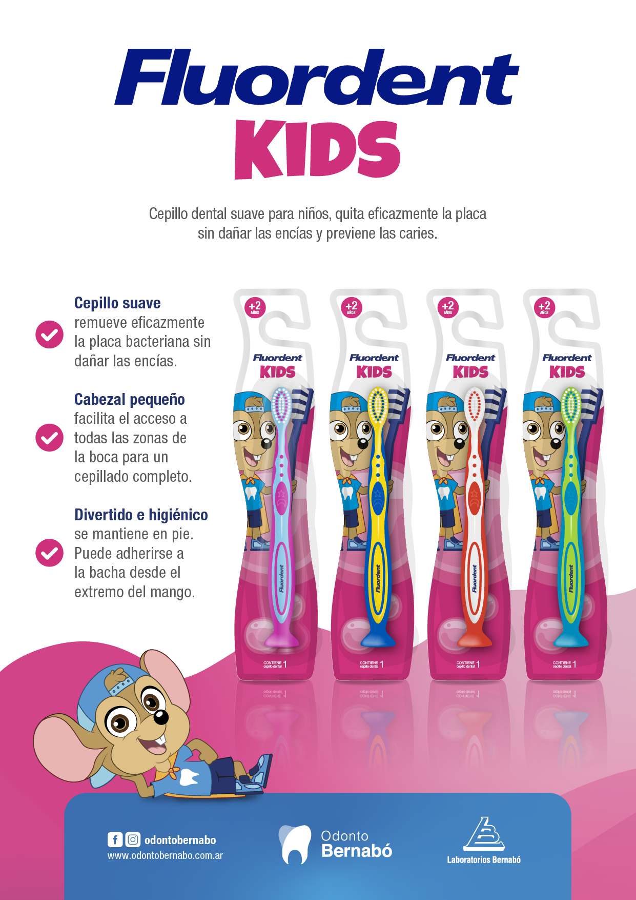 El cepillo dental Fluordent Kids está indicado para niños por su cabezal pequeño que facilita el acceso a todas las zonas de la boca para un cepillado completo, sus cerdas suaves que remueven eficazmente la placa bacteriana sin dañar el esmalte ni las encías y su mango con goma inyectada para un cepillado seguro, sin deslizamientos. Además, se mantiene en pie ya que puede adherirse a la bacha gracias a su sopapa coocada en el extremo del mango.